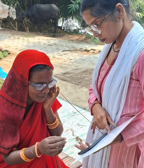 In India, a woman holds a phone and a clipboard in front of a seated woman. There is a piece of string between them